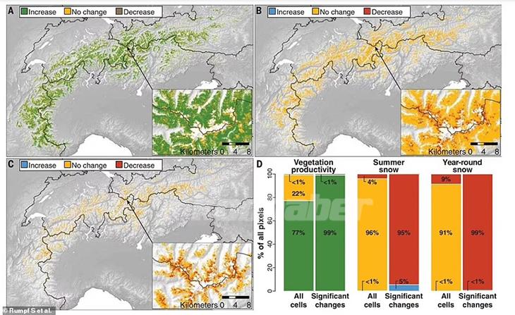 38 yılı kapsayan çalışmada, Alpler’deki kar kütlelerinin yıllar içinde gözle görünür bir şekilde eridiği ve yerlerini yeşil bitki örtüsünün kapladığı gözlendi.